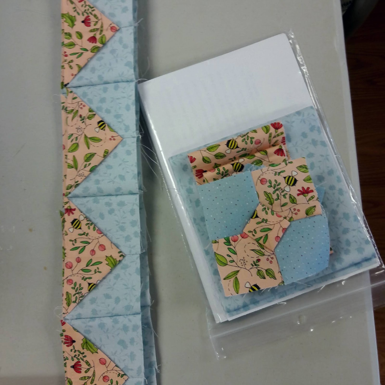 We also started on our first border. It was fun to see those borders come together. Sue hasn’t decided on a center yet, but she got her borders done. She even made that cute little bow tie for her next border.