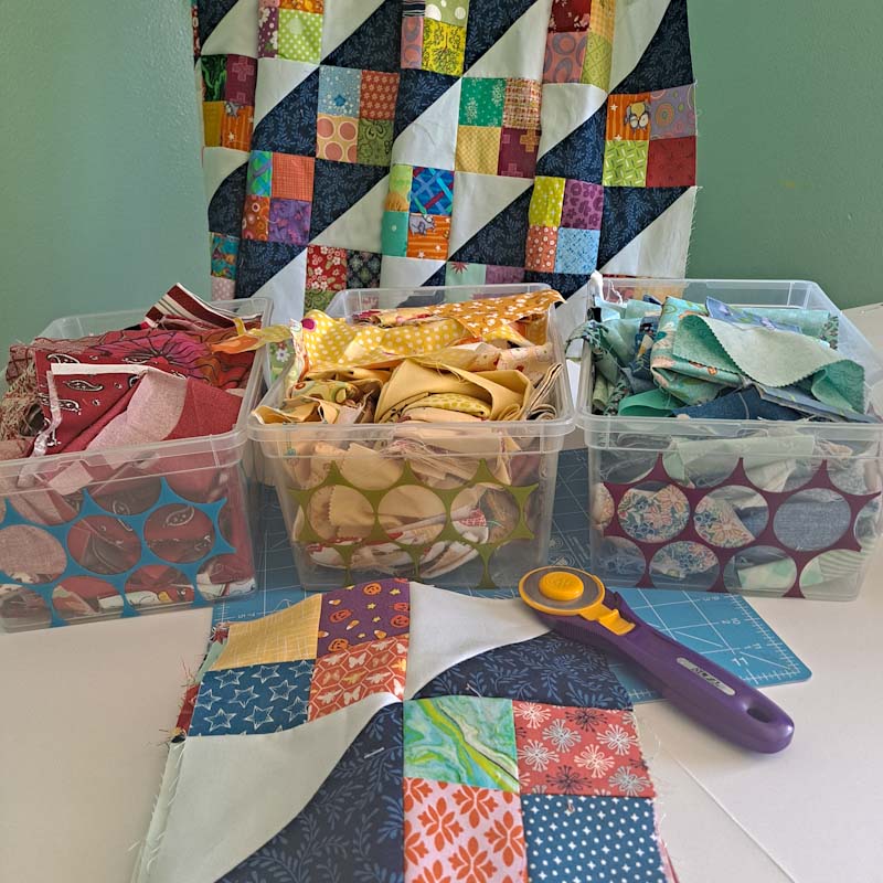 Find more examples of combining scrap fabric in this post. Where I share how donated scraps where sorted, cut and made ready for charity quilts.
