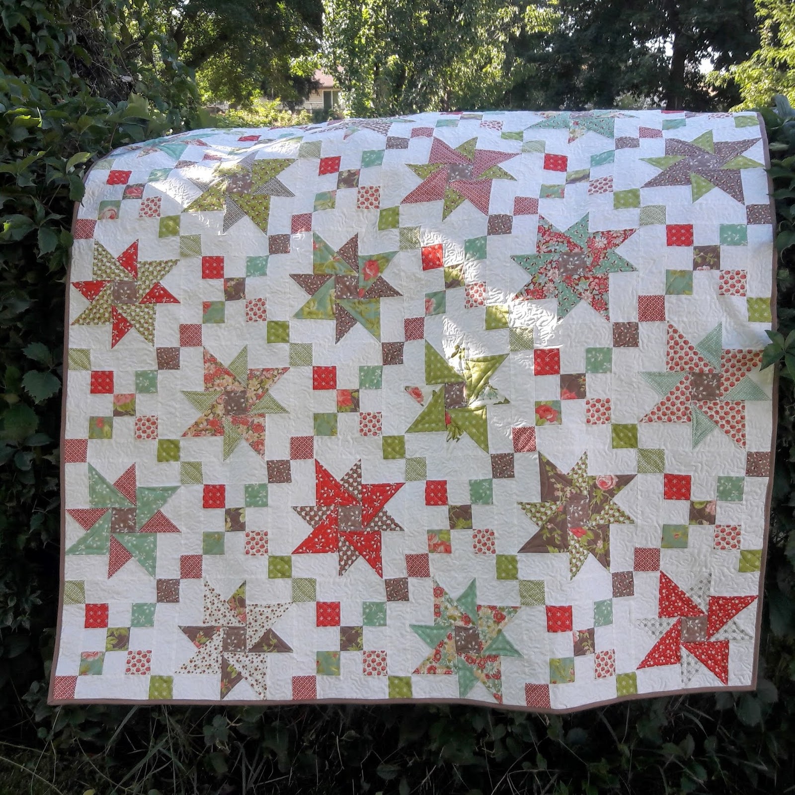 I’m thrilled to finally be able to share Twisted Stars an Irish Chain quilt with you. I made it last summer. You may notice that my background is lush and sunny. Not exactly the weather one find in Utah in January.