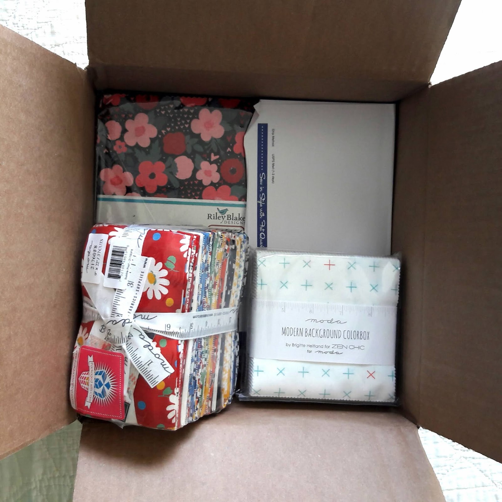 This little box of pretties arrived from Fat Quarter Shop. I had noticed that cute fat eighth bundle on a recent Flash Sale. And since it is ALWAYS more fun to pay for fabric than shipping I went ahead and did a little more shopping. Happy mail is fun, especially unboxing fabric. I already have ideas for most of these pre-cuts.